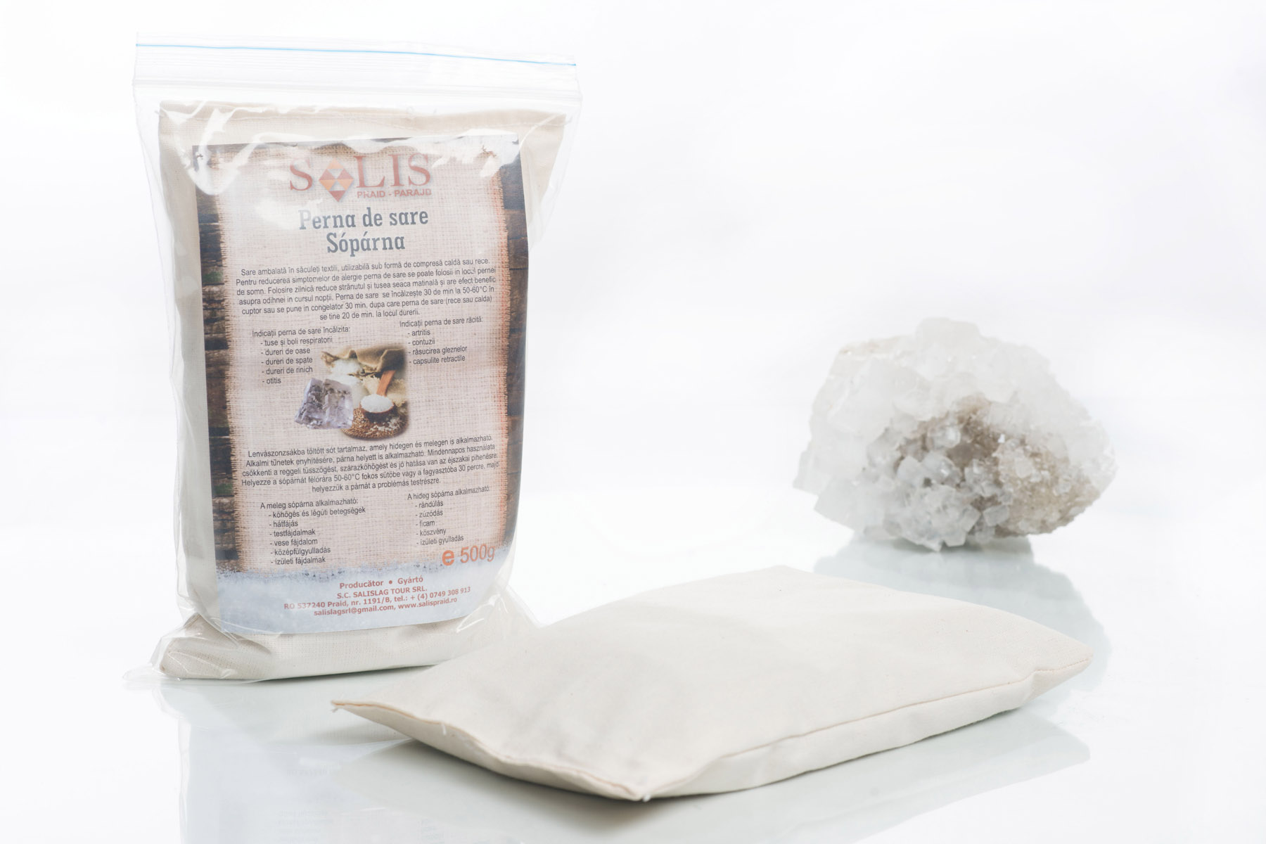 Sare ambalată în săculeţi textili, utilizabilă sub formă de compresă caldă sau rece.